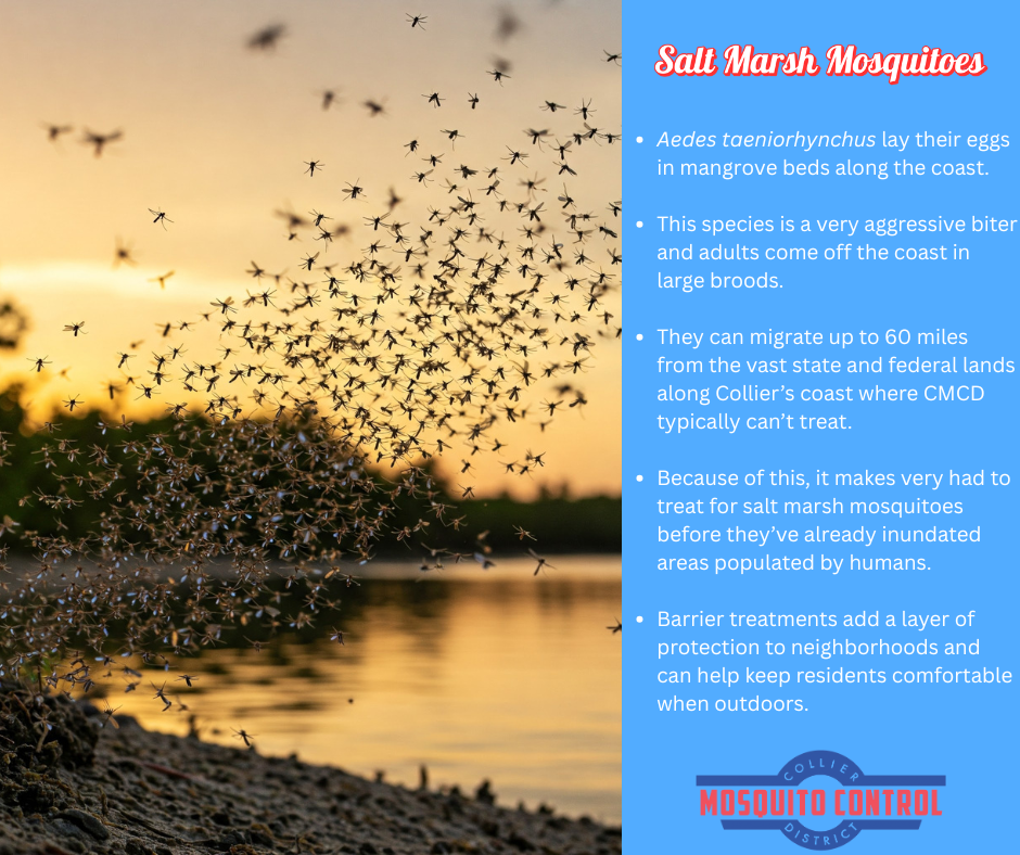 Ae. taeniorrhynchus come off the coast in large broods and can travel up to 60 miles at the adult stage from Collier’s state and federal public lands. Because CMCD typically does not perform mosquito control on public lands, this makes it difficult to target this species at the source. Instead, this species must be targeted at the adult stage upon entering populated areas.