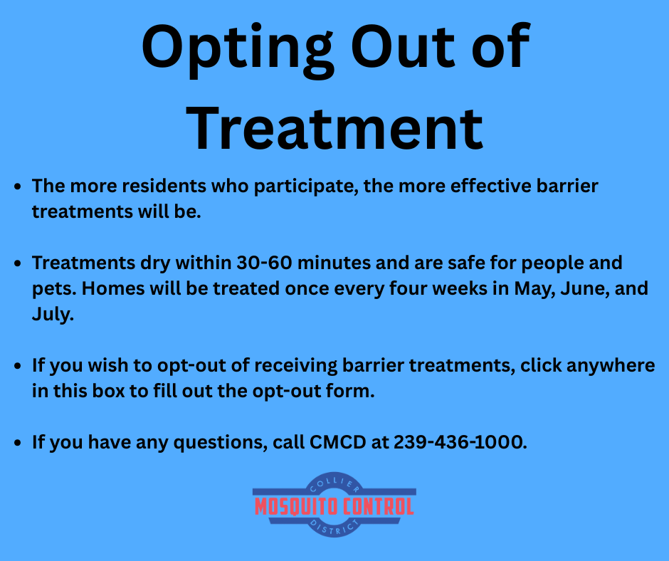 Yes. The effectiveness of residual barrier treatments increases when more properties in the community are treated. Your participation plays an important role in supporting a more comprehensive and successful mosquito control effort. However, because these treatments fall outside of CMCD’s general workplan and are being offered specifically to Port of the Islands residents, participation is entirely optional. Since the treatments involve applying products to vegetation and surfaces on private property, CMCD is offering residents of Port of the Islands the opportunity to opt out. If you do not wish to participate, you may fill out the OPT-OUT FORM or call our office at 239-436-1000 to be added to the opt-out list.